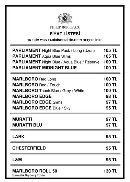 Philip Morris grubuna ait sigara markalarına 16 Ekim 2025 tarihinden itibaren geçerli olmak üzere yeni bir zam yapıldı. Türkiye Tekel Bayileri Platformu (TTBP) Başkanı Özgür Aybaş, sosyal medya hesabından yaptığı açıklamada fiyat artışının bugünden itibaren yürürlüğe girdiğini duyurdu.